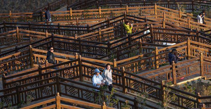 4月26日,游客漫步在拉萨市南山公园的阶梯步道上。