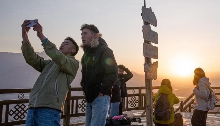 4月26日日出时分,游客在拉萨市南山公园拍照。